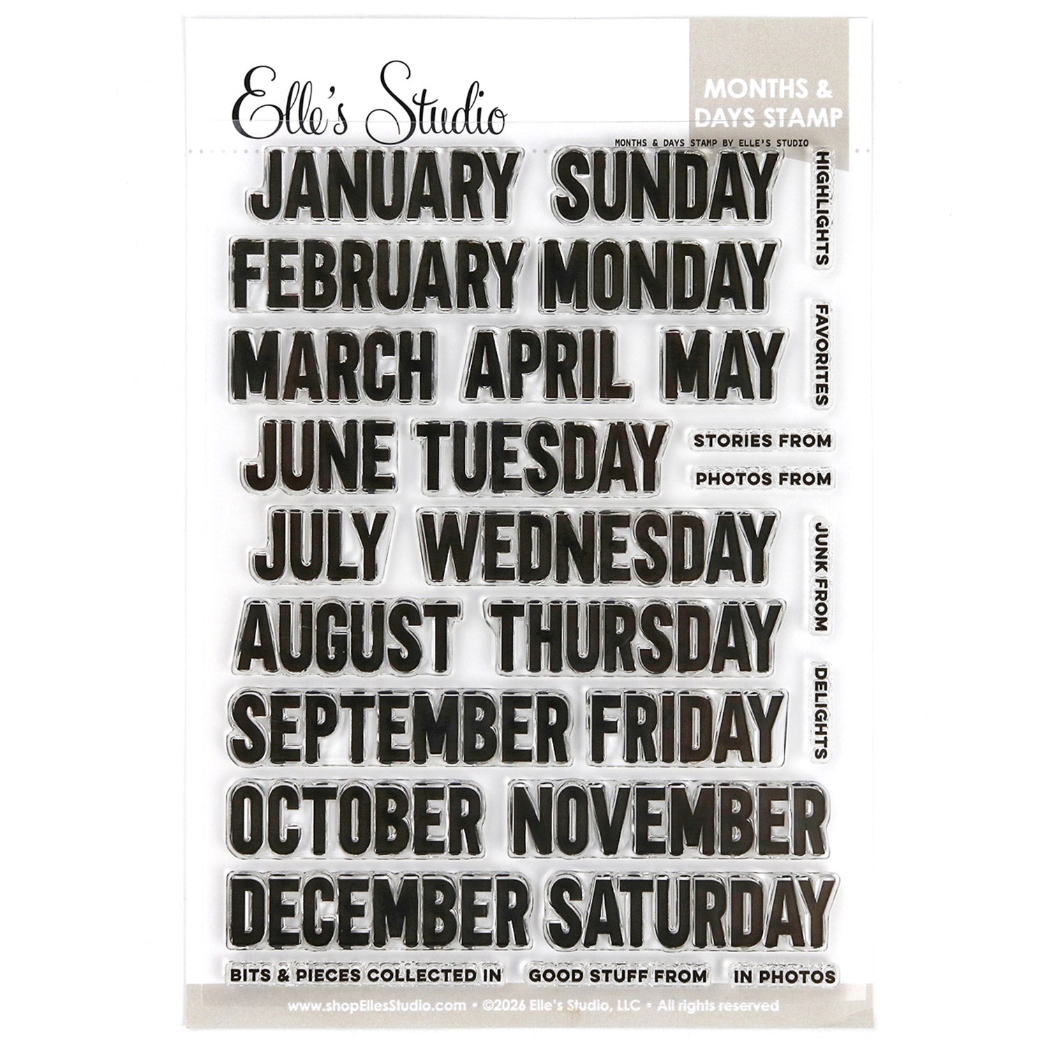 It measures 6 x 8 inches and contains 28 stamps. It is a photopolymer clear stamps that resist yellowing. The months and days on this stamp set measure .62 inches tall.